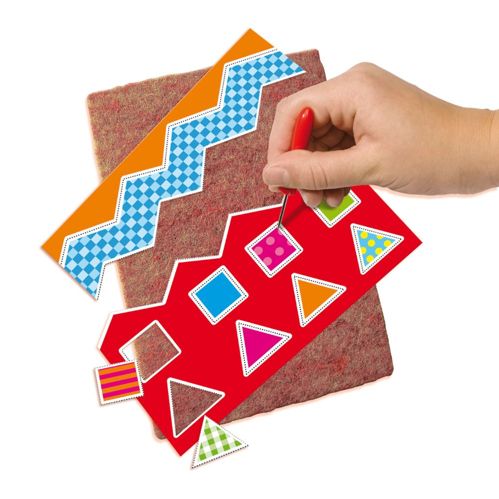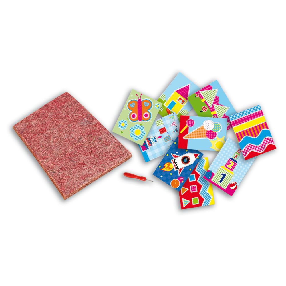 El set contiene varias láminas ilustradas de cartón rígido, un punzón infantil diseñado para manos pequeñas, y una base de espuma para apoyar el papel durante la actividad. Todos los materiales son seguros, sin piezas pequeñas ni elementos peligrosos, lo que lo convierte en una opción adecuada incluso para los más pequeños del hogar.