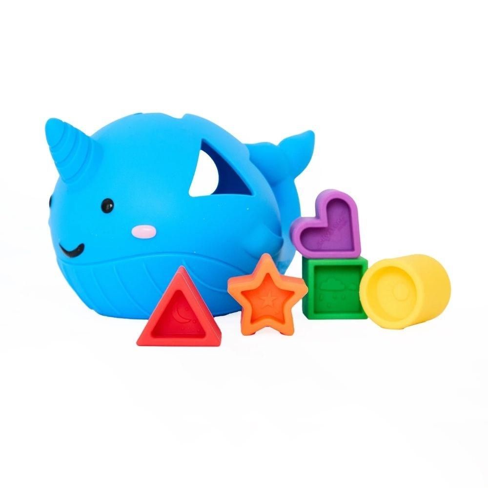 El clasificador está compuesto por una estructura principal con forma de narval y varias piezas geométricas de colores, diseñadas para encajar en sus aberturas. El tamaño y diseño de las piezas están pensados para una manipulación segura y cómoda por manos pequeñas, favoreciendo un uso repetido tanto en casa como en entornos educativos.