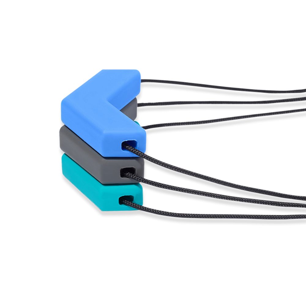 El collar mordedor Chevron está disponible en tres colores, que indican su nivel de dureza: