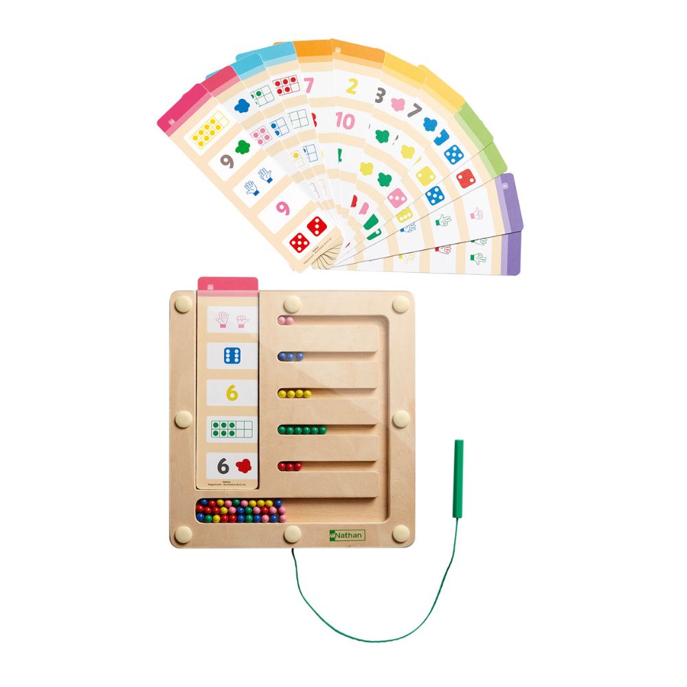 El niño debe desplazar, con la ayuda del lápiz imantado, las bolitas a lo largo de cada recorrido en el tablero, guiándolas hasta formar la cantidad correspondiente al número señalado. El diseño del circuito refuerza el trazo de cada cifra, de modo que el pequeño aprende no solo el valor del número, sino también cómo se escribe, todo mientras juega. Este uso continuo mejora la comprensión de la secuencia numérica y consolida el aprendizaje mediante la repetición activa.