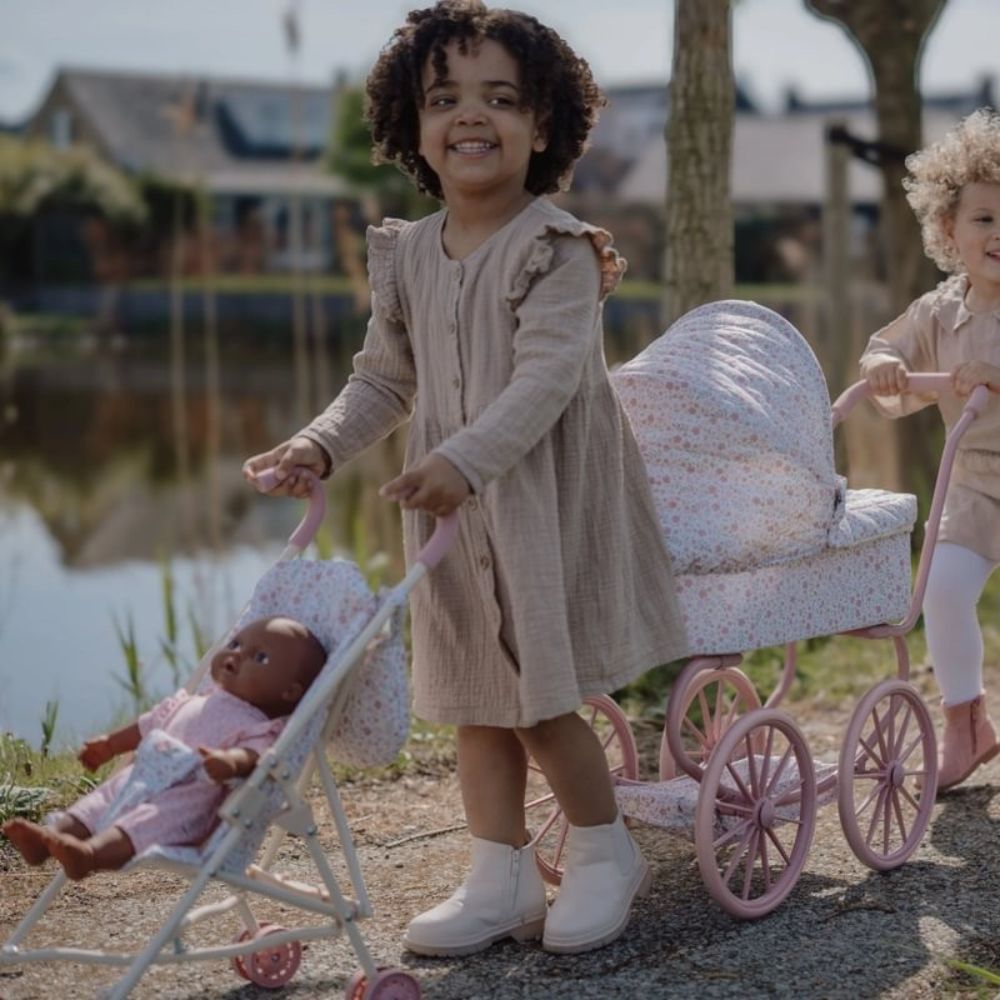 ¿Te imaginas ver a tu peque paseando a su muñeca como si fuera de verdad? Con la sillita para muñecas de metal Little Dutch – Flores, todo el juego simbólico cobra vida. Este cochecito destaca por su estructura metálica robusta, diseñada para acompañar el ritmo de juego diario sin perder estabilidad. Su asiento con delicado estampado floral aporta un toque dulce y encantador que enamora a primera vista.