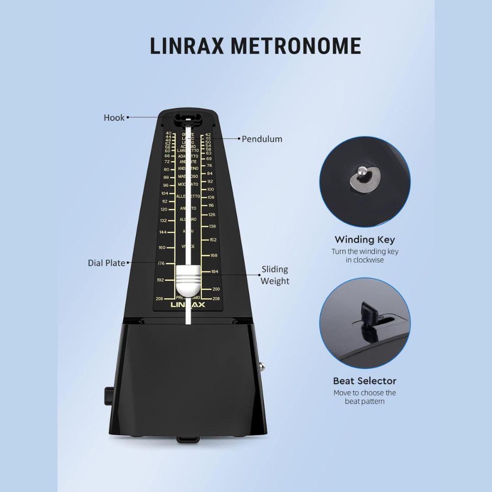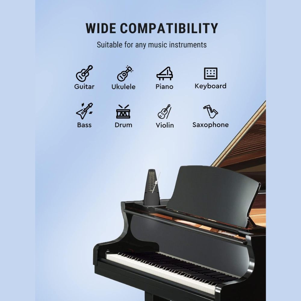 Completo di tutte le funzioni, offre un intervallo di tempo di 40-208 bpm e una selezione di tempo di 0,2,3,4,6 che soddisfa le esigenze di tutti gli strumenti. Dotato di un pannello frontale che ti aiuta a scegliere la velocità e l’atmosfera musicale più appropriata.