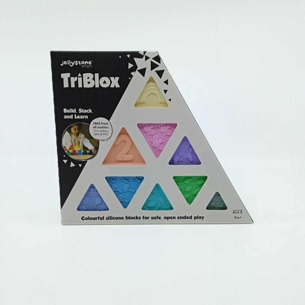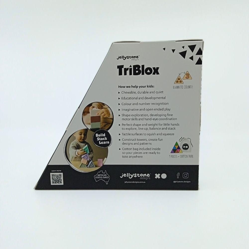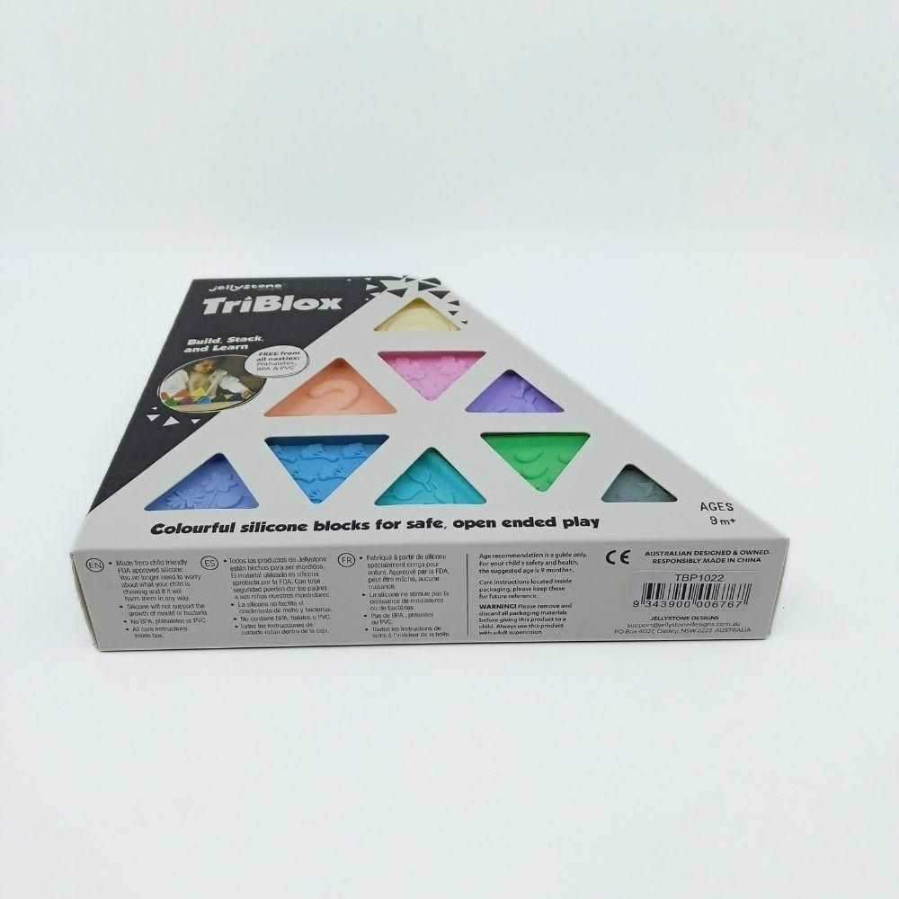 El set Triblox Pastel está compuesto por bloques de silicona alimentaria libre de BPA, numerados del 1 al 9, con ilustraciones texturizadas en el reverso y un interior completamente hueco. Son aptos para esterilizador, lavavajillas o lavado con agua tibia y jabón, lo que facilita su higiene tras el uso con agua o arena.