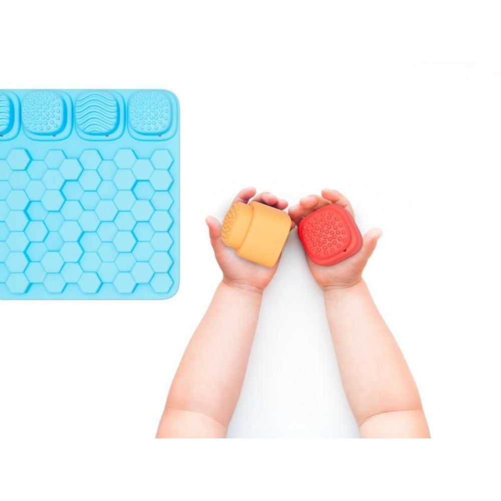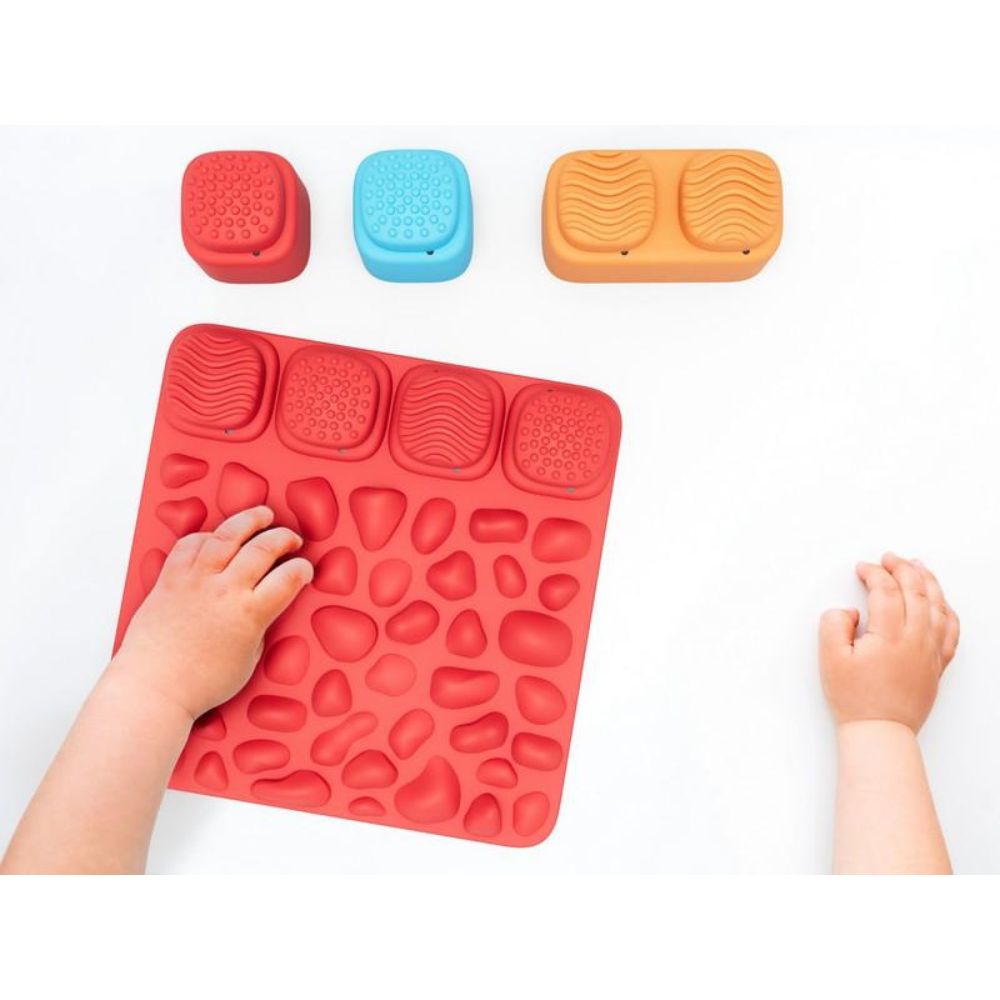 El set incluye 4 alfombrillas de 20 x 20 cm y 16 bloques sensoriales de 5 x 5 cm. Están fabricados en plástico PAP suave, flexible y 100 % reciclable, lo que garantiza seguridad, durabilidad y sostenibilidad. Cada alfombrilla presenta un relieve diferente (ondas, rayas o formas geométricas), lo que potencia la variedad de estímulos. Son fáciles de limpiar y se pueden mojar hasta 30 ºC.