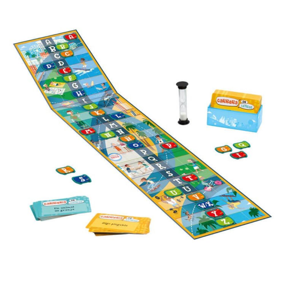 Carrera de Letras es un juego de mesa educativo y competitivo en el que dos equipos se enfrentan para conseguir letras respondiendo correctamente a preguntas. En cada ronda se lee una tarjeta y… ¡Comienza la cuenta atrás! El equipo tiene que decir una palabra válida relacionada con la consigna y mover las letras empleadas hacia su lado. El primer equipo en acumular ocho letras gana la partida.