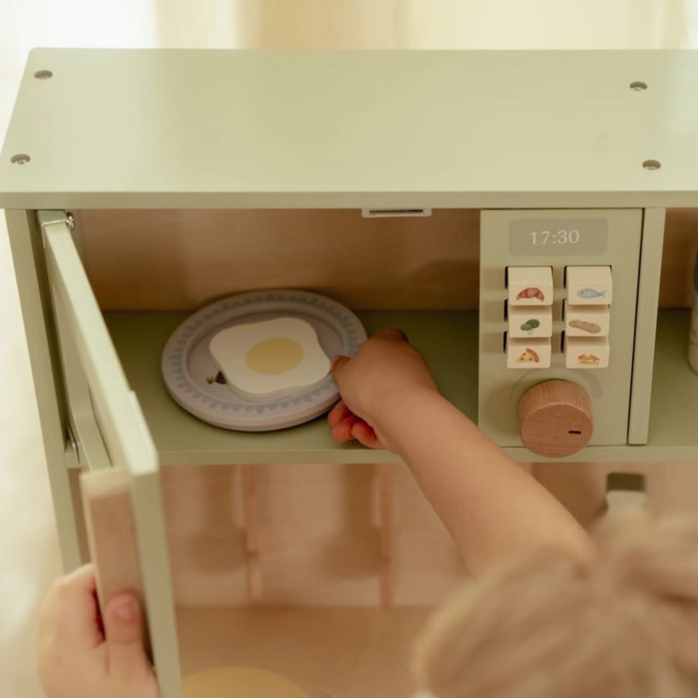 Fabricada en madera robusta, con una estructura en color menta suave y detalles en acabado natural. Incluye muchos accesorios: dos sartenes, tres platos, utensilios de cocina, un microondas con perillas ilustradas, un fregadero integrado, un armario para almacenar, y accesorios como una botella de aceite de oliva y un set de sal y pimienta. Todo está pensado para resistir el uso diario y ofrecer un juego cómodo y realista.