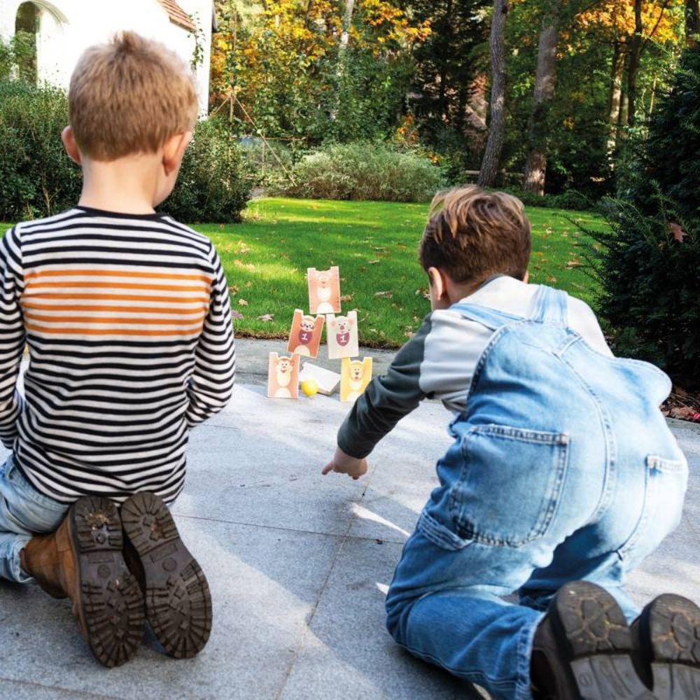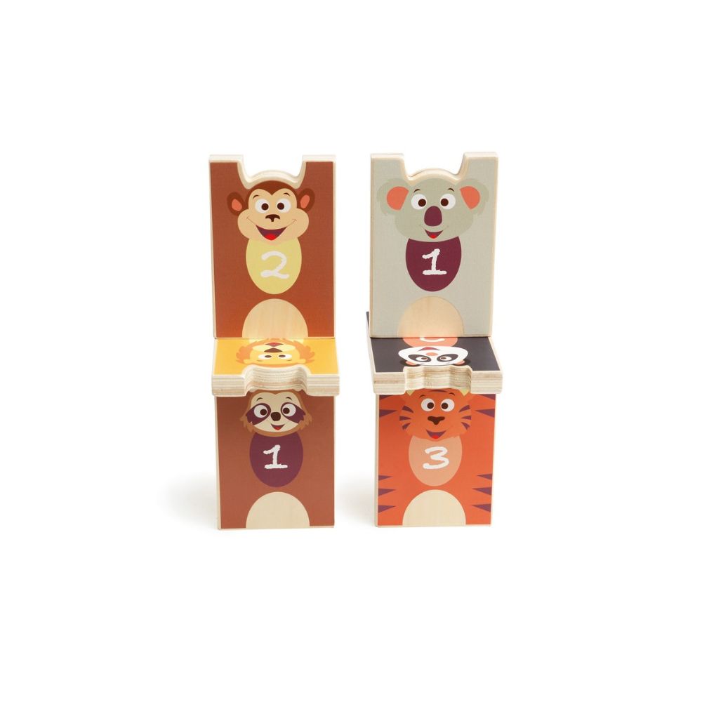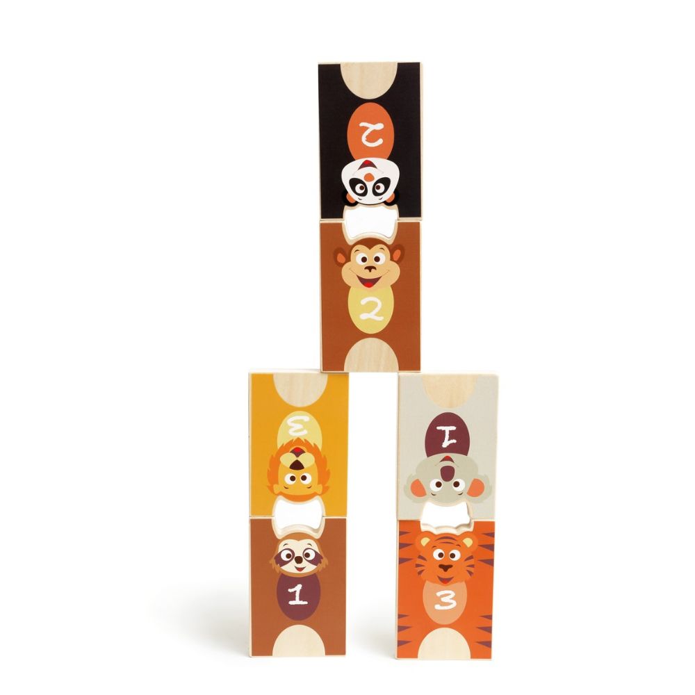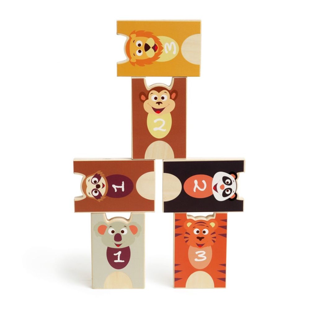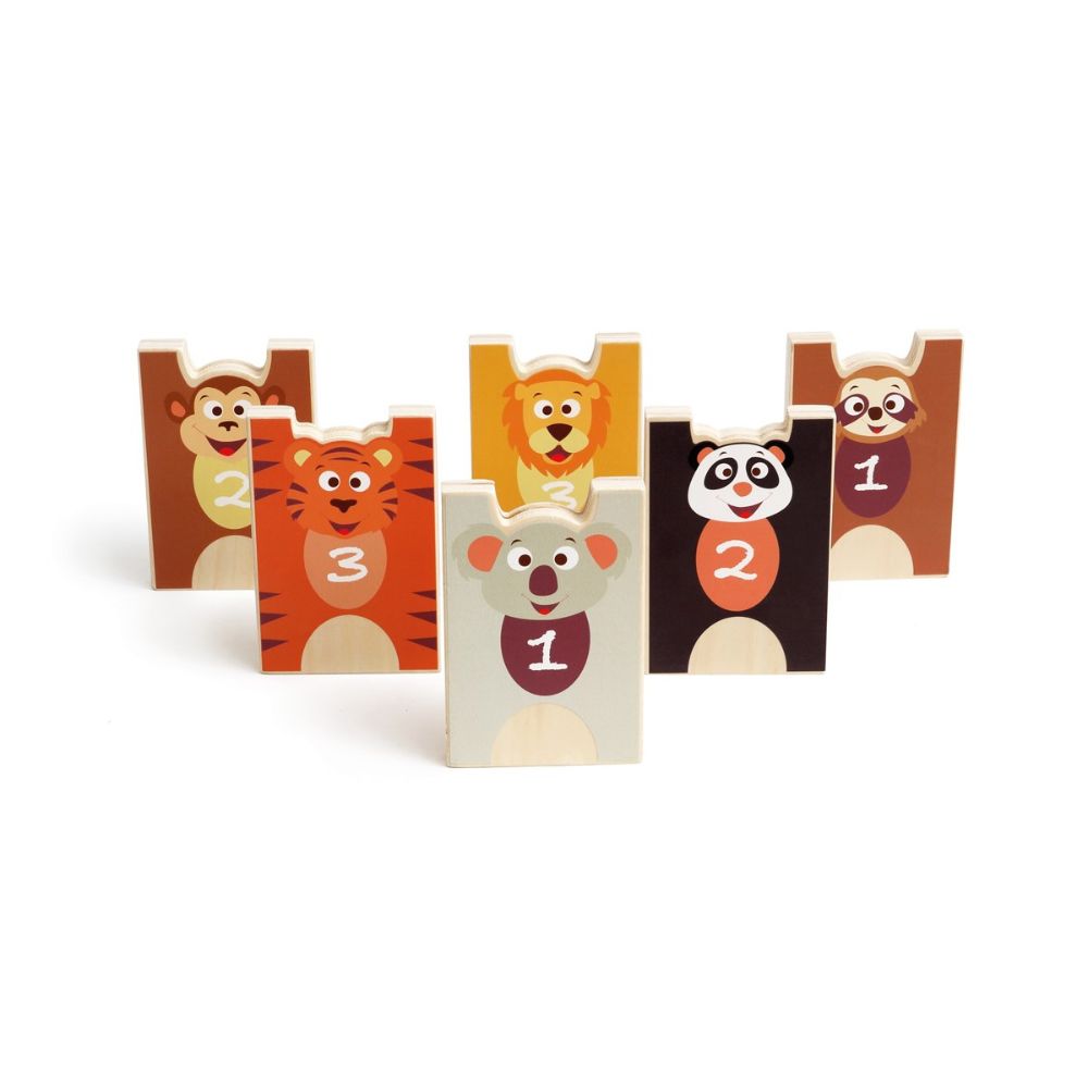 Los niños pueden organizar las piezas como bolos en línea y lanzar una bola para derribarlos, o bien probar su equilibrio apilando los animales en diferentes combinaciones para formar torres cada vez más altas.