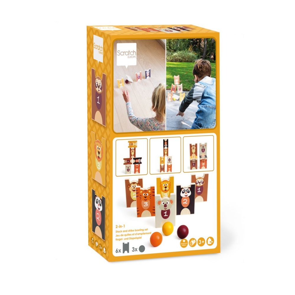 El set viene completo con todas las piezas necesarias para jugar a los bolos o apilar animales.