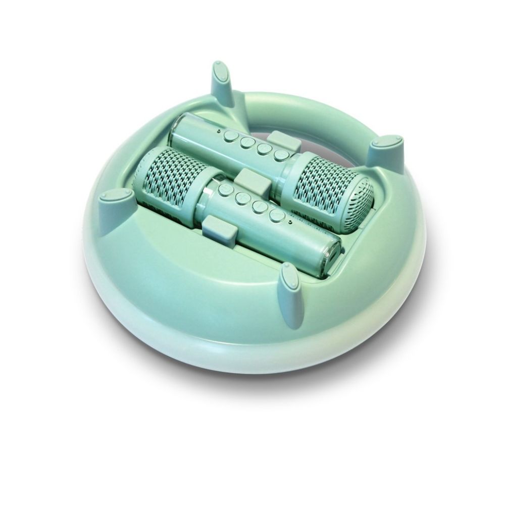 El KidyKaraoke está formado por un altavoz portátil con potencia de sonido pensada para uso doméstico, dos micrófonos inalámbricos adaptados a manos infantiles, sistema de luces LED integradas y controles simples. Incorpora batería interna recargable mediante USB-C y está diseñado con materiales resistentes para un uso frecuente por parte de niños.