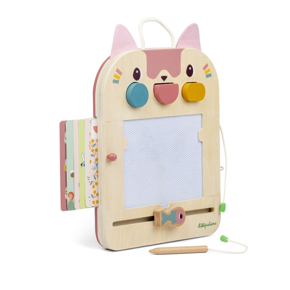 La Pizarra mágica de Jeanne la gata de Lilliputiens invita a los más pequeños a dejar volar su creatividad una y otra vez. Con un simple movimiento, los dibujos desaparecen y el juego vuelve a empezar, estimulando la imaginación y la coordinación mano-ojo. Fabricada en madera y con diseño ergonómico, es perfecta para practicar la motricidad fina de forma divertida.