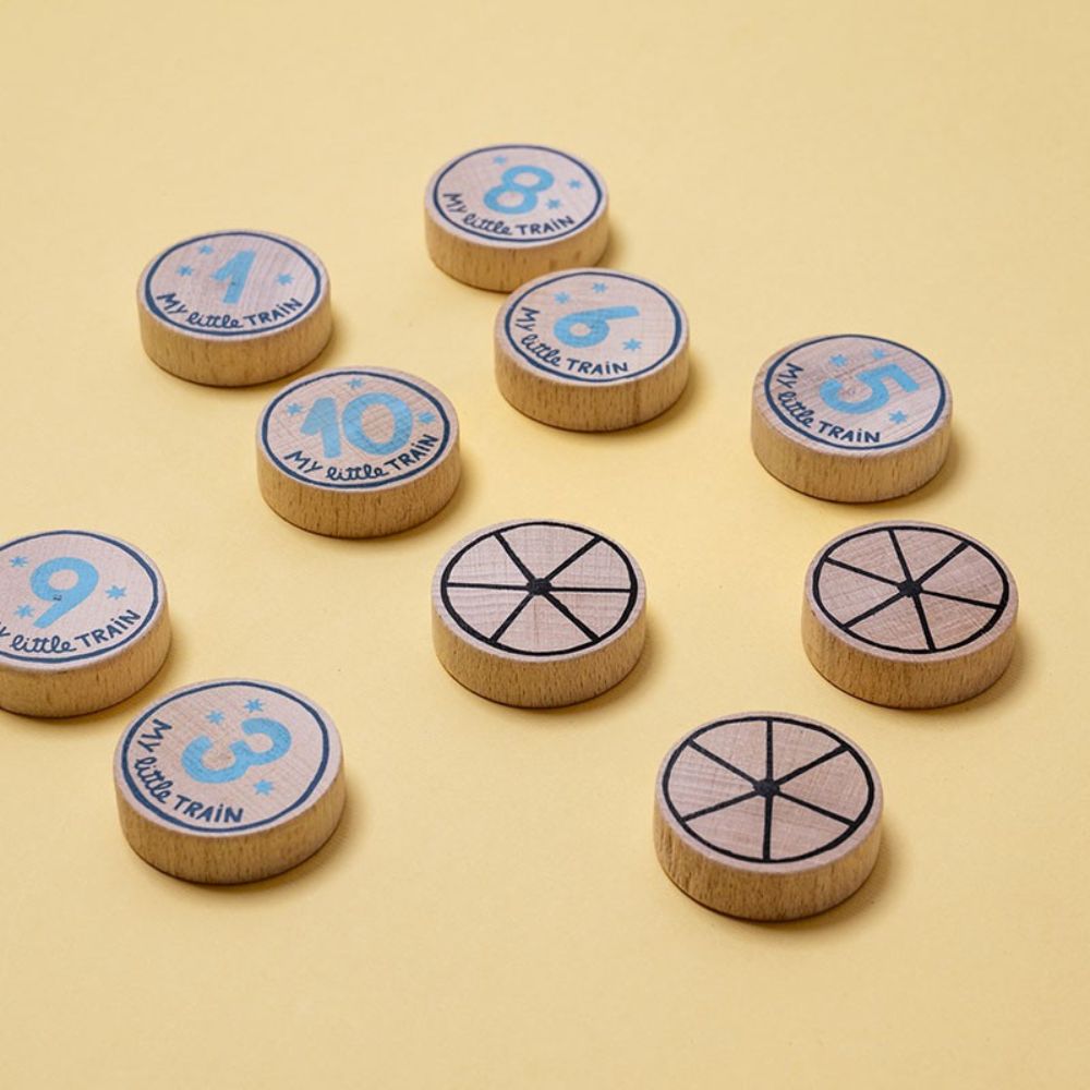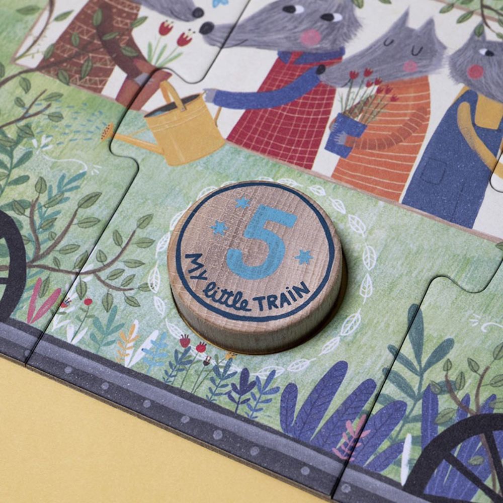 Se puede presentar poco a poco, empezando por uno o dos vagones y ampliando después el tren completo. El niño o la niña va uniendo las piezas de cada vagón y encajando la pieza de madera correspondiente, mientras observa los animales y se familiariza con la secuencia numérica. También se puede acompañar con lenguaje sencillo, nombrando números, animales, colores o cantidades para enriquecer aún más la experiencia de juego.