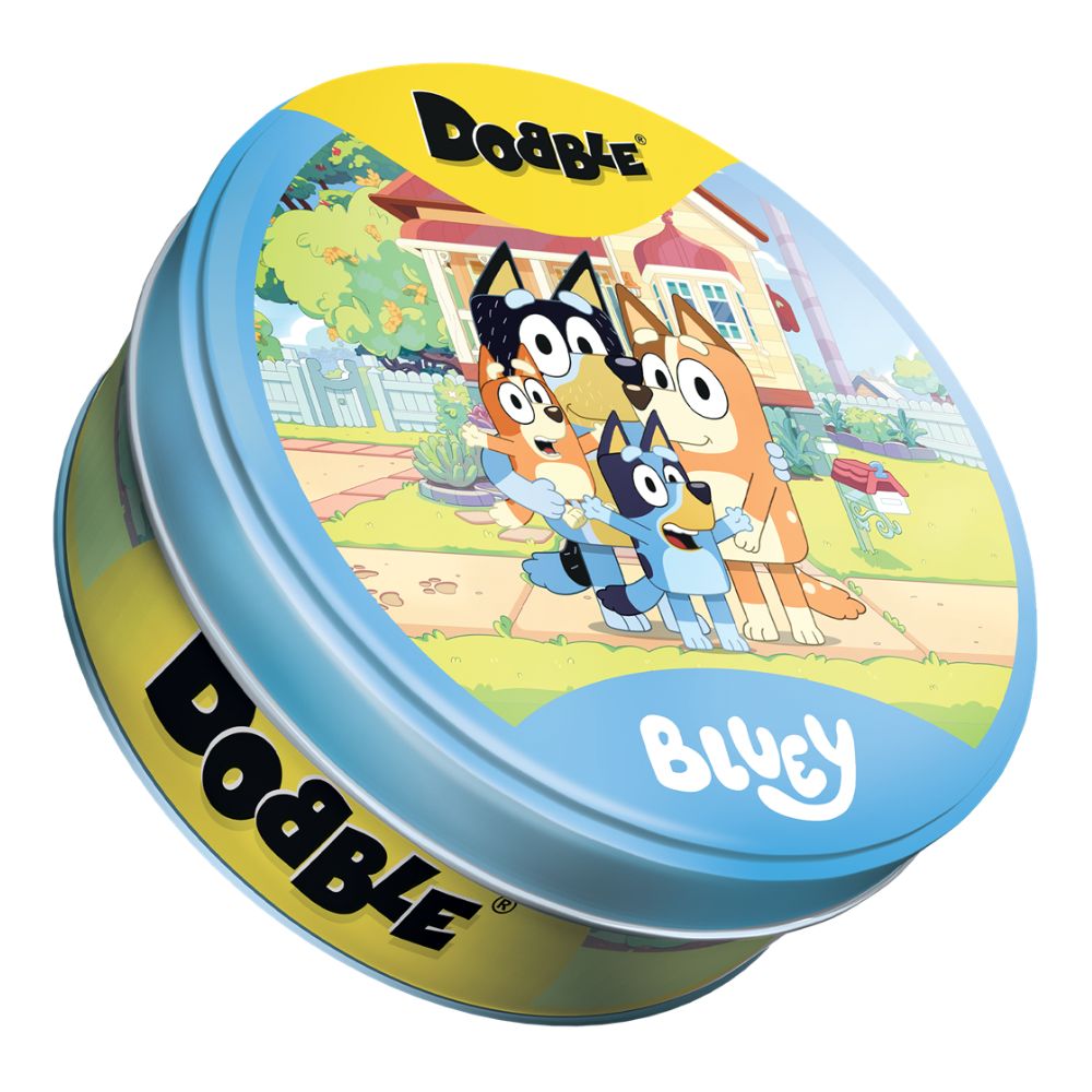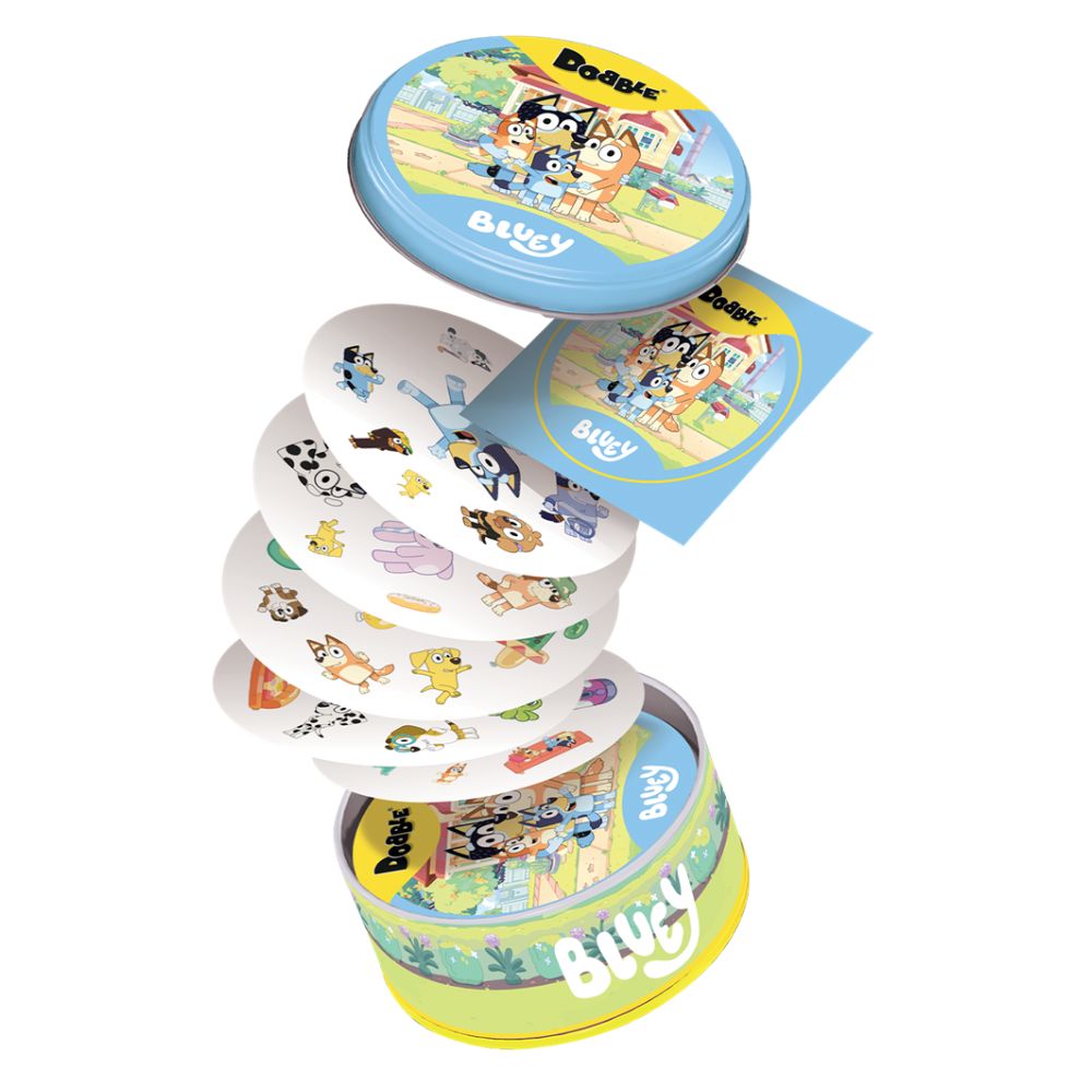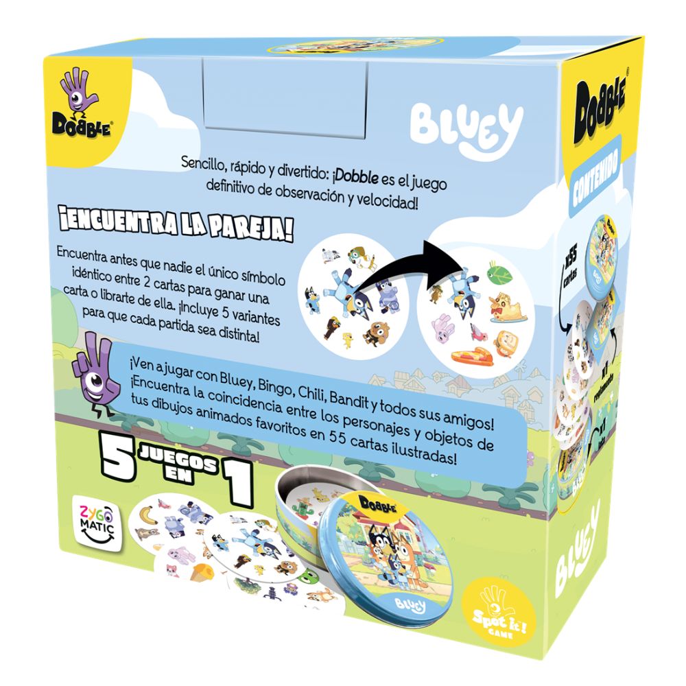 Dobble Bluey incluye 55 cartas ilustradas con personajes y elementos del universo Bluey. Está diseñado para 2 a 8 jugadores, con partidas de unos 5 minutos. Ofrece diferentes variantes de juego manteniendo siempre la misma mecánica de observación rápida.