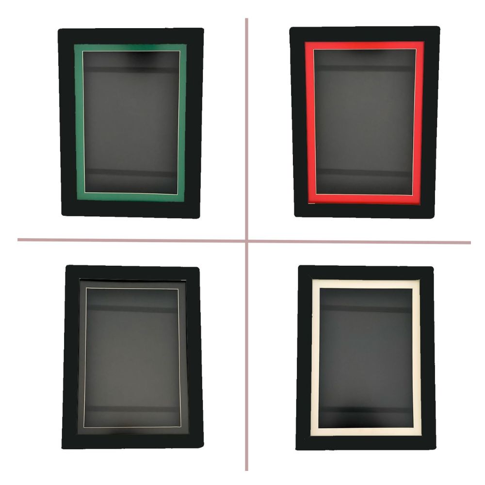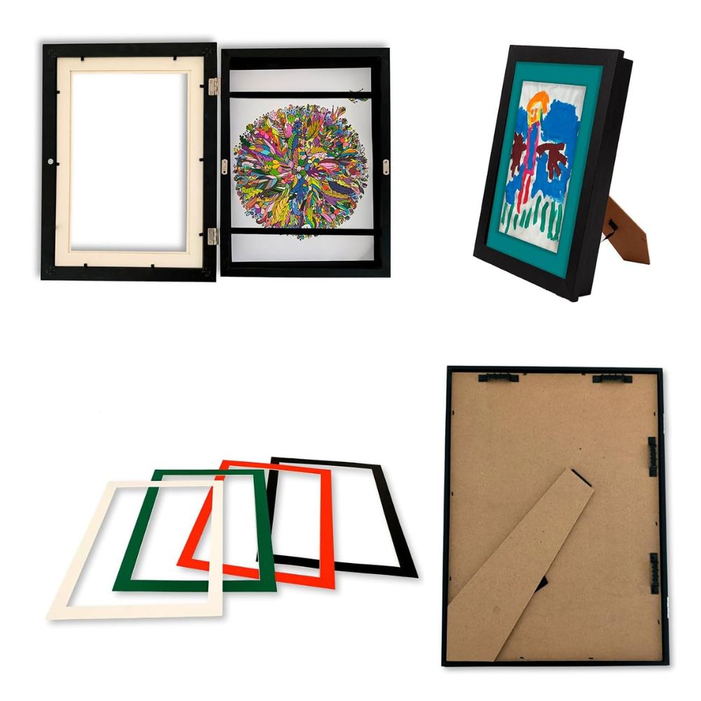 El marco está diseñado para dibujos en formato A4 y presenta un acabado en color negro que se adapta fácilmente a cualquier espacio. Incluye cuatro paspartús diferentes que permiten cambiar la presentación del dibujo según el estilo o el tamaño del papel. En la parte trasera incorpora gomas elásticas que permiten guardar los dibujos anteriores dentro del marco, manteniéndolos ordenados y protegidos. Disponible en color negro