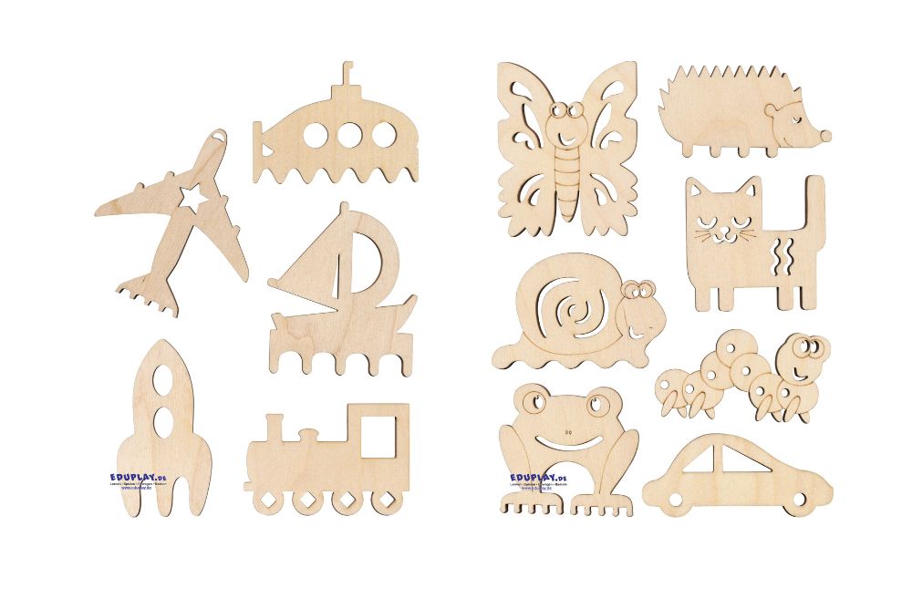 Fabricado en contrachapado de abedul de alta calidad, este set ofrece resistencia y durabilidad. Sus dimensiones están adaptadas a las manos infantiles para facilitar la manipulación (por ejemplo, locomotora de 9,5×6,4×0,3 cm y erizo de 10×5,4×0,3 cm).