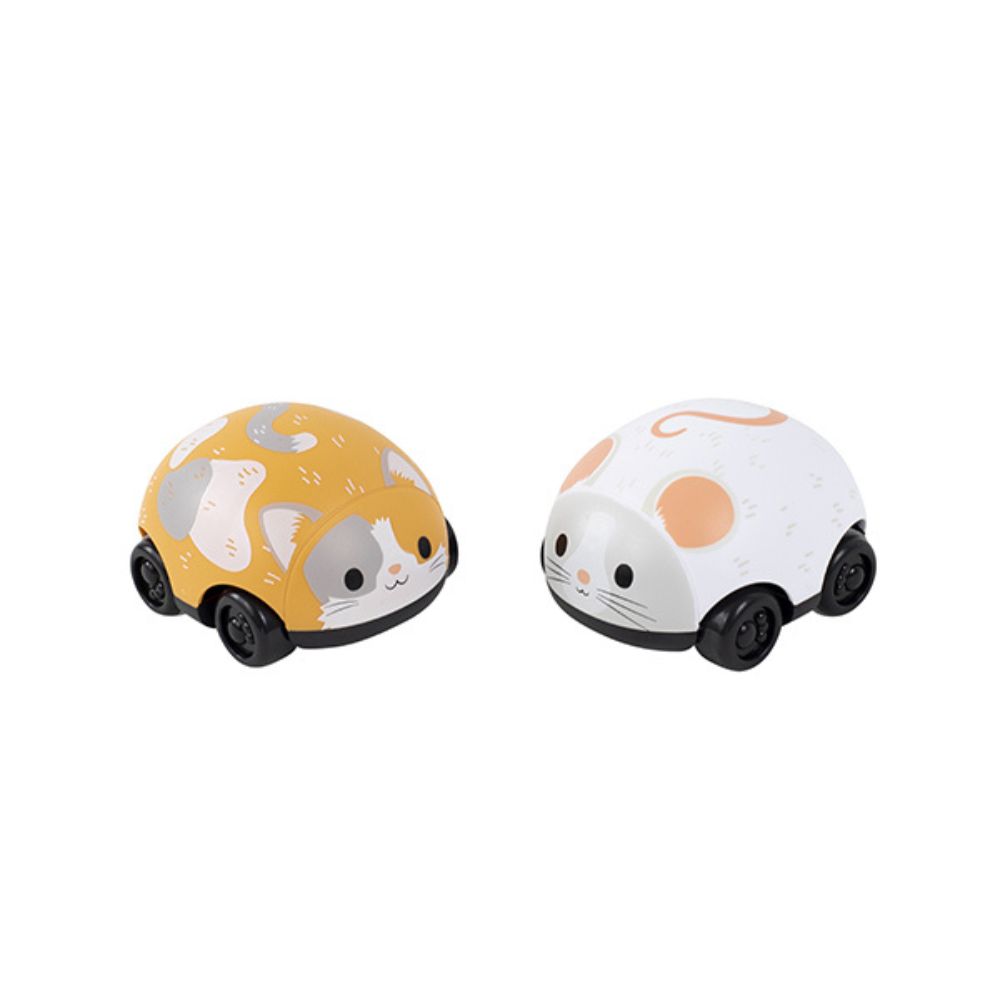 Este set incluye un gato y un ratón de juguete con mecanismo de tracción retráctil. Ambos están diseñados en un formato compacto y seguro, pensados especialmente para bebés. Se presentan en una caja de cartón y no requieren pilas para funcionar.