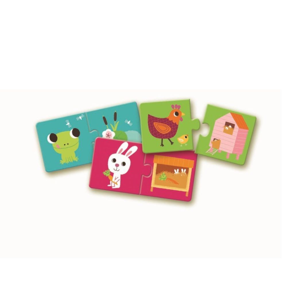 Para jugar, se colocan todas las piezas sobre una mesa y el niño debe buscar qué dos mitades encajan formando la pareja correcta de animal y hábitat. Mientras encaja las piezas, puede decir en voz alta el nombre del animal y su casa, lo que le ayuda a recordar palabras y a mejorar su expresión oral. Este juego puede hacerse solo o en compañía de un adulto.