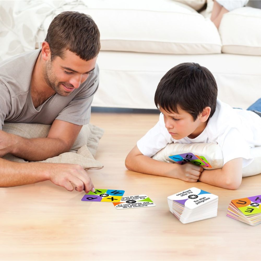 Contiene 75 cartas de letras y 120 cartas de pista, además de las reglas del juego. Está recomendado para niños a partir de 6 años, aunque es igual de útil y entretenido para adolescentes y adultos. Su formato compacto permite llevarlo a cualquier parte.