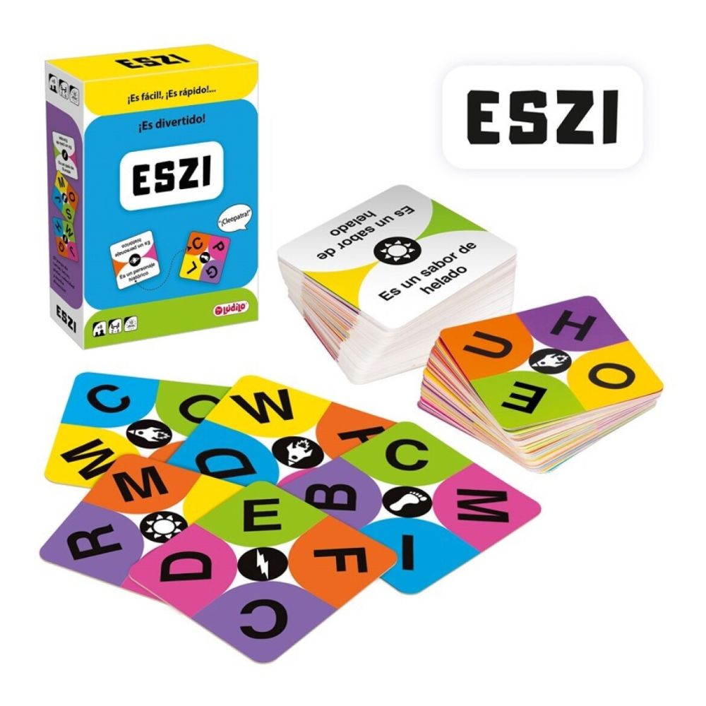 ESZI es un juego de cartas para entrenar el vocabulario y la agilidad mental. Cada jugador tiene 5 cartas de letras y, en cada turno, se revela una carta de pista con una categoría, como “bebida con gas” o “orden que le das a un perro”. Los jugadores deben decir rápidamente una palabra que empiece por una de sus letras y que encaje con la pista. Si aciertan, descartan la carta. ¡Gana el primero en quedarse sin letras!