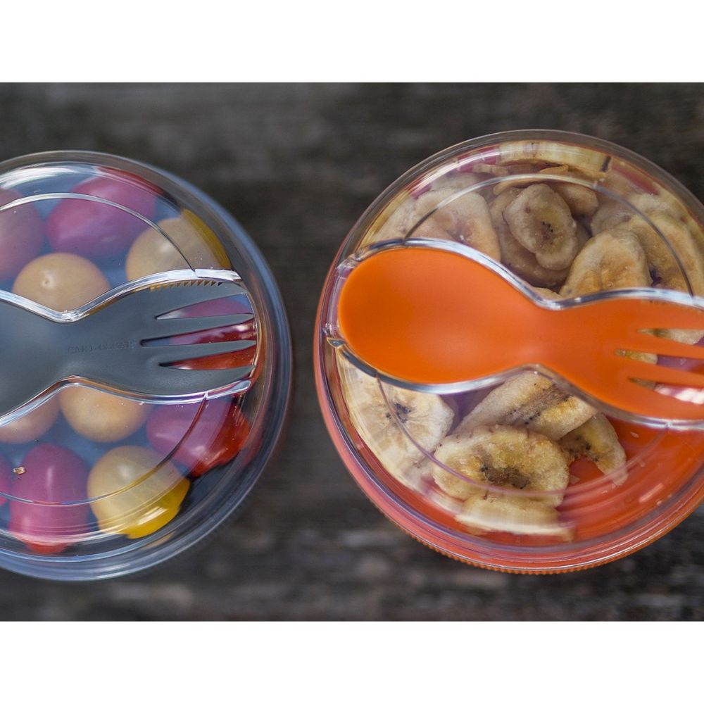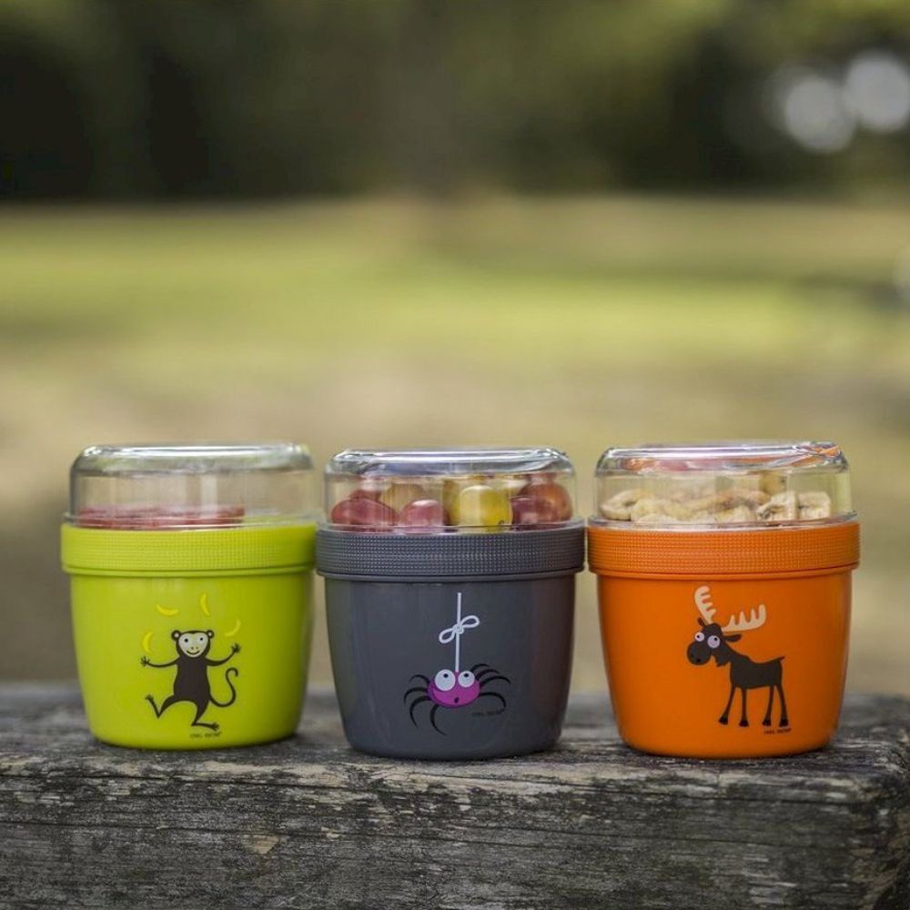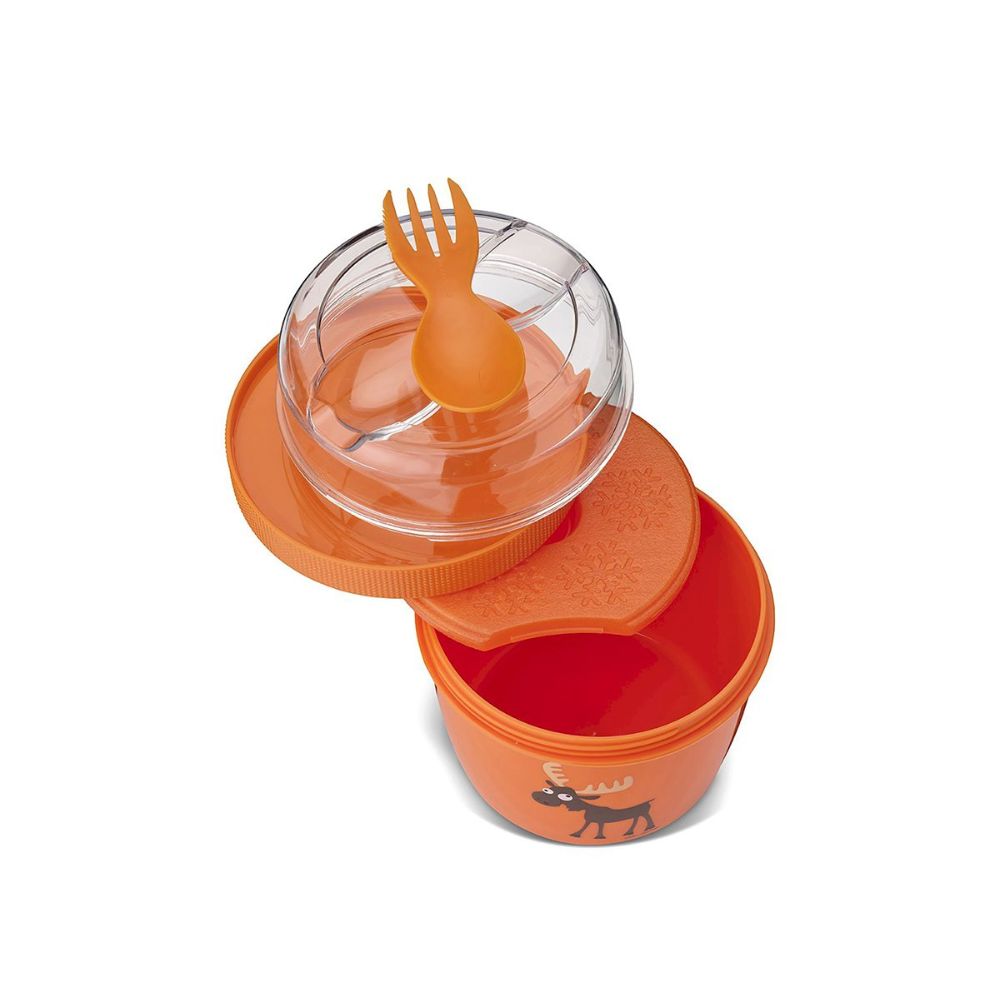 Cuenta con una capacidad pensada para meriendas o pequeñas comidas, siendo perfecta para frutas, cereales, frutos secos o postres. Disponible en color naranja.