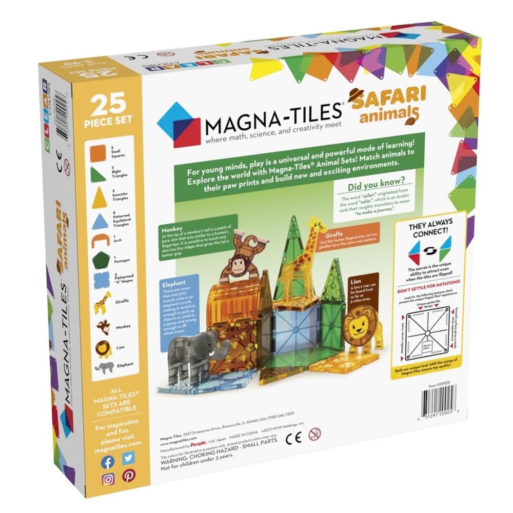 El set Magna-Tiles Safari Animals incluye un total de 25 piezas translúcidas de colores. Entre ellas se encuentran cuadrados pequeños, triángulos equiláteros, triángulos isósceles, triángulos rectos, un arco, un pentágono y piezas especiales en forma de “X”, además de cuatro figuras de animales: una jirafa, un mono, un león y un elefante. Todas las piezas están fabricadas en plástico ABS de calidad alimentaria, libre de BPA, látex y ftalatos, y cuentan con un sistema de unión magnética resistente que produce un característico “clic” al conectarse.
